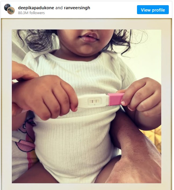 দীপিকার শেয়ার করা ছবিতে দেখা যায়, ছোট মেয়ে দুয়া একটি প্রেগন্যান্সি টেস্ট কিট ধরে আছে, যাতে পজিটিভ ফলাফলের দুটি লাল দাগ স্পষ্ট। পাশে রণবীর ও দীপিকার হাতও দেখা যাচ্ছে। বড় বোন হতে যাওয়া দুয়ার এই ছবিটিই এখন সামাজিক যোগাযোগমাধ্যমে ভাইরাল। দীপিকা পোস্টের ক্যাপশনে কোনো দীর্ঘ বার্তা না লিখে শুধু ‘ইভিল আই’ ইমোজি ব্যবহার করেছেন।