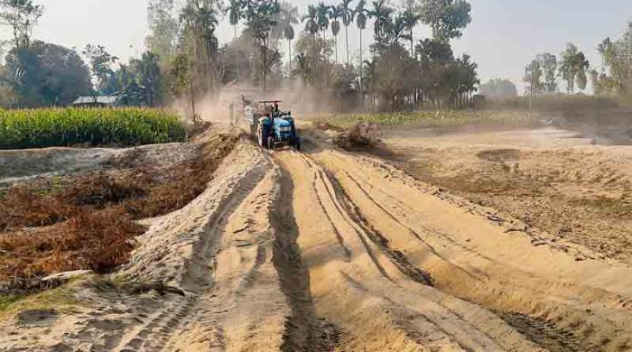 কুড়িগ্রামে অবৈধ ছয় চাকার বালুভর্তি ট্রাক্টরের কারণে ভেঙে পড়ছে রাস্তা
