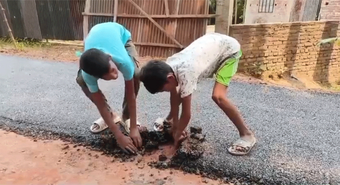 শিশুদের হাতের টানেই উঠছে সড়কের পিচ, কাজ বন্ধ করে দিলো স্থানীয়রা
